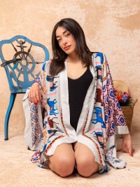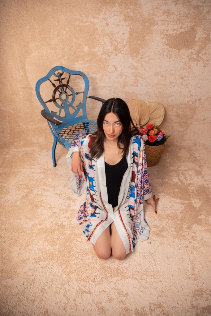 %100 ipeksi dokuda viskon kumaştan üretilmiştir. Viskon kumaşlar yapısı gereği hava geçirme özelliğine sahip olup yaz ayları için en tercih edilen kumaş türüdür. Kimononun son derece rahat ve dökümlü bir formu vardır. Standart bedendir.